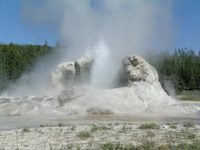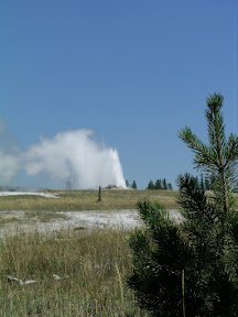 I checked in at the Ranger's station and they figured Old Faithful would go off in about 40 min or so. It goes off roughly every 90 minutes. Even then, there were throngs of people near the visitor's center, so, I figured that in the meantime, I'd try to get away and find a better spot for pictures at some other point on the boardwalk surrounding the geyser. I managed to find a spot with nobody else and even had a little tree that could provide some foreground for the picture. Since I knew my camera could take a series of still shots in succession, I sat down trying to figure out how to get it to work. Unfortunately, I misunderstood how the camera was going to work. I could take a series of pictures, but it would only keep the last five pictures once you let go of the button. So, I naively held down the button all through the best part of the eruption, only to remove my finger later on. I had lost the best pictures. Oh well.