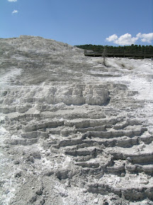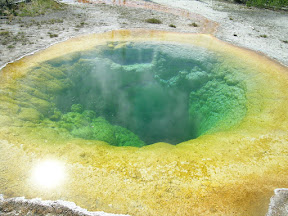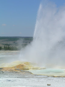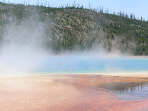 Anyway, on my way up to the Grand Prismatic Spring, I passed Excelsior Geyser. I don't know if I can imagine that pool being a Geyser since it was sooo huge! But it was still a beautful cerulean pool. Coming around to the grad spring, I noticed some wayward hats sitting in the bacterial mat just out of reach of the boardwalk. I took off my hat so that it too wouldn't succumb to the wind god's fancy. The spring itself was just another breathtaking sight. The colours! It made the spring almost look like one of those false colour elevation maps of Mars.