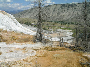 By the time I was set up, it was getting close to noon, so I took off to do some sightseeing. The first stop was Mammoth Hot Springs, which was crawling with people. There were a lot of different features which looked, well, alien. Places like the Minerva Terraces, which were a series of calcite terraces created from the mineral rich spring water. I'd have to say my favourite part was Canary Spring just because of all the colour and how the calcite has enveloped the trees. After walking along the lower terraces, I decided to walk the upper terrace loop. Yeah, technically you're supposed to drive around it, but I was itching to stretch my legs out after being cooped up in the car for most of the last 4 days. Unfortunately, there was not spot on the springs where you could actually sit in the warm water. It makes sense I know especially given all the traffic, but it still would've been fun. There was a spot on the upper loop where people used to soak but it just did too much damage so they stopped allowing it in the 70's.