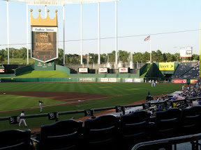 I was pleasantly surprised with Kauffman Stadium. It had a lot of concrete reminiscent of parks pre-Camden Yards, but it didn't look like a monstrosity, it actually had some character to it. There were the waterfalls in right-center field, some fun spiraling ramps to get into the park, and the funny looking scoreboard framed by the Royals' logo. Also, it was pretty much symmetric except for a couple of small details including the fact that the vistor's bullpen was significantly smaller than the home team's. Home field advantage :-)
