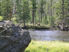 The first campground I came across (Madison Junction), was full, so I kept going crossing all my fingers and toes. I wasn't paying too much attention to the beauty around me, but I figured I'd definitely be going along these roads again a few times while I was there. Coming up to the Noris campground, the sign said that there were vacancies. Sweet! Pulling in to the parking lot by the gate, many people were running up to the board to mark down the empty sites and then running off quickly to their cars. I didn't have much time. So, I went straight for the walk-in tent sites figuring that they'd be the last ones to go. When I got there, what luck! There was one left. I quickly threw my tent down and started setting it up. Not five minutes later, a guy and his son drove up looking to see if there were any sites available. While they were debating what to do, I realized that there was plenty of room in my site to share so I offered them the option so that at least they didn't have to camp way outside the park. It didn't take them long to take me up on the offer, so they started to set up their tent beside mine. The father, Roger, and his son Mitch were from Olympia, WA and they were taking the trip to show Mitch Yellowstone. Roger had been there before, back in the late 80's during the big forest fire that had burnt so many of the hillsides in the area.