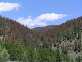 From Walden, I headed south so that I could enter Rocky Mountain National Park from the western side. This meant going through a nice forested pass. Well, it would have been nice except that the hills looked like it was autumn, and these were pine! It was astounding all the damage that the pine beetle was doing to the area. They figure that it's mostly caused by the warmer temperatures recently from global warming, which mean that in the winter, there isn't a harsh freeze so the beetle is surviving the winter to proliferate during the summer months.