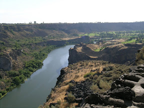 After lunch, I made my way to Twin Falls, Idaho, while the vegetation slowly got denser and greener. I stopped in Twin Falls to get groceries and then, on the road out of town, I saw a sign that read "point of natural interest". I had been seeing these every once in a while, so I decided to turn off. What a great idea! Cutting through this plateau as far as the eye could see was a beautiful canyon cut out by Snake River.