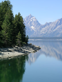 One of my first stops was right after cross the Jackson Lake Damn. Going across the damn, I looked out the window to the right and was completely floored by the mountain range reflected in the mirror smooth surface of Jackson Lake. Thanks to some interpretive signs, I also picked up a few little tidbits of information about the geology of the area. At the top of Mount Moran, it was possible to see a solid black column sticking out of the mountain. This was an old volcano vent where the lava solidified and then the mountain eroded away around it, leaving the lava plug sticking out into the sky. Also, the road I was driving on was on a very flat rocky plain with only scrub for vegetation. It turns out that the valley floor is filled with glacial till that's just so rocky, it's hard for vegetation to get a hold. However, looking at the mountains, it got a lot greener. Moving up from the base of the peaks, it was easy to see other bands of vegetation from lush forest and then thinning into alpine tundra.
